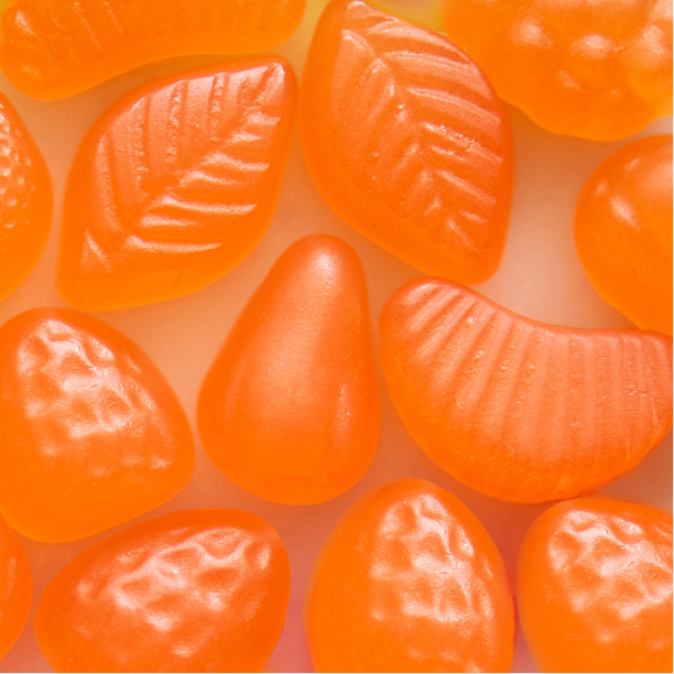 A gelatin gummy showcasing the vibrant orange color at a usage rate of 0.16% w/w.